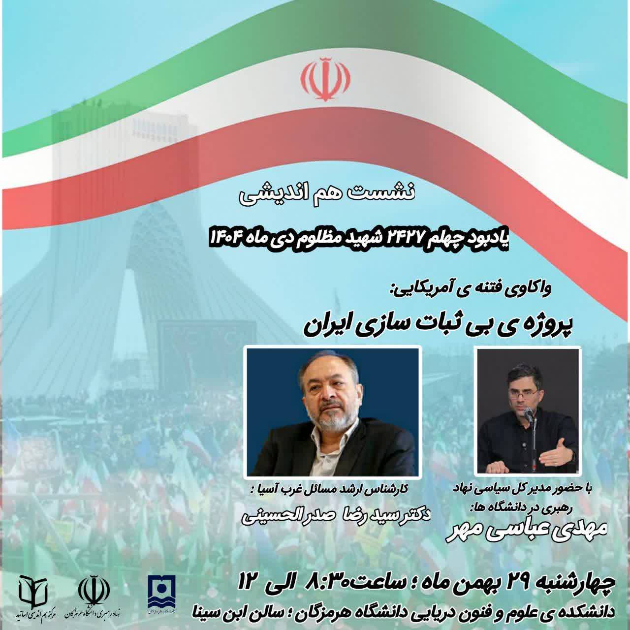 یادبود چهلم ۲۴۲۷ شهید مظلوم دی‌ماه با محوریت واکاوی پروژه بی‌ثبات‌سازی ایران در دانشگاه هرمزگان برگزار می‌شود